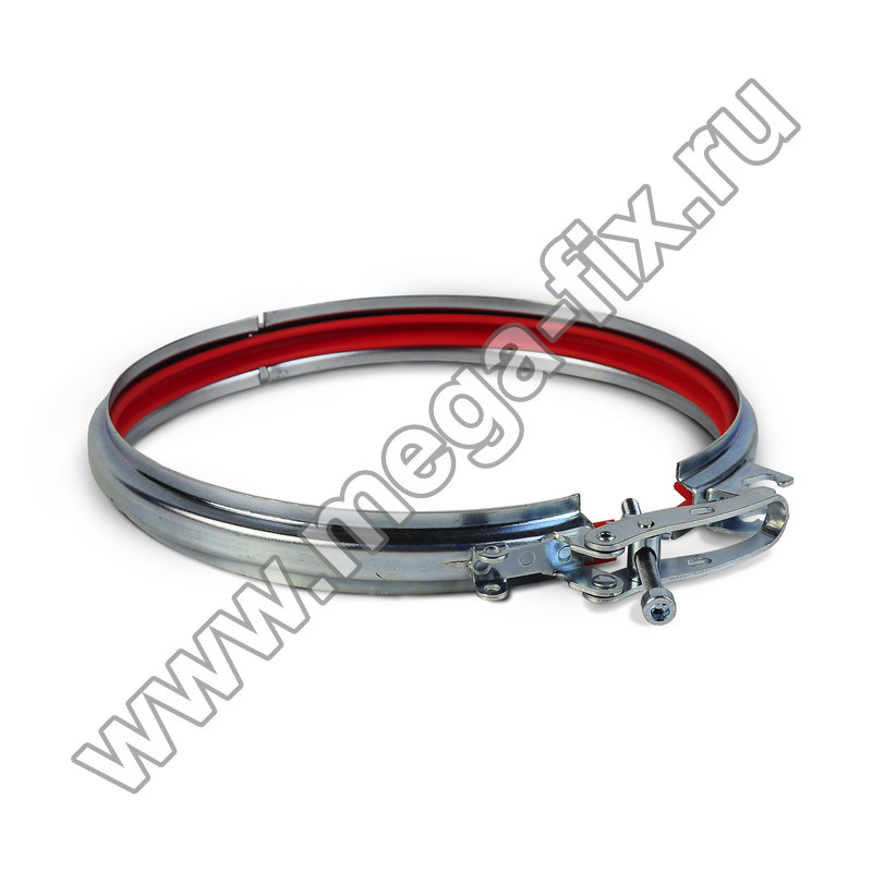 Хомут представляет собой два стальных полукольца, дополненных шарниром с клепкой, а так же быстроразъемным замком, оснащенным рычагом. Рычаг обеспечивает оперативный монтаж без необходимости использования каких-либо инструментов. Внутри хомута установлен поливинилхлоридный профиль, гарантирующий герметичность соединения.
